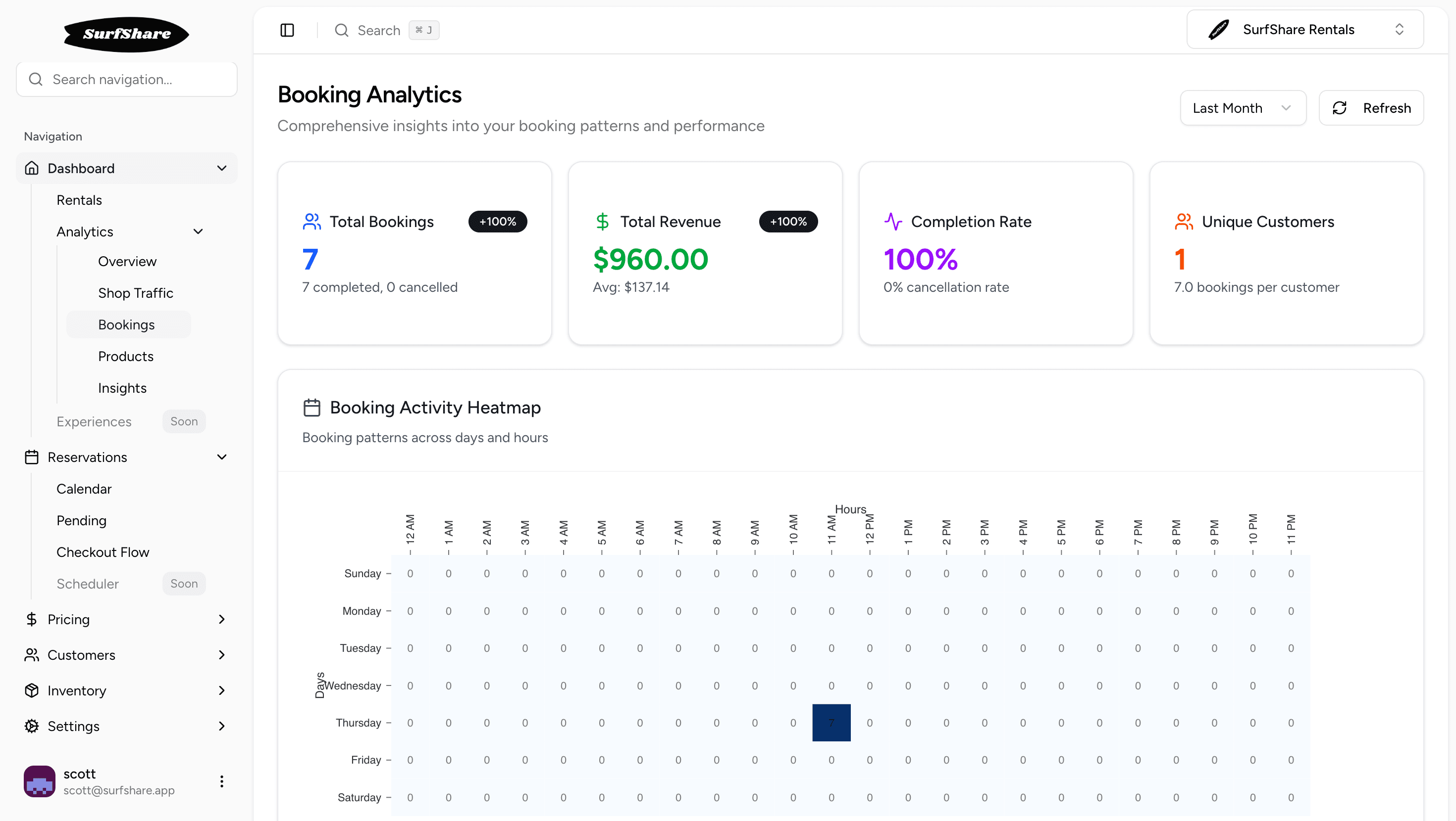 Manage a beachside kiosk and a downtown shop from the same account. Transfer gear between locations, set separate pricing, and view analytics across the whole operation — revenue, popular gear, peak booking times, and customer trends.